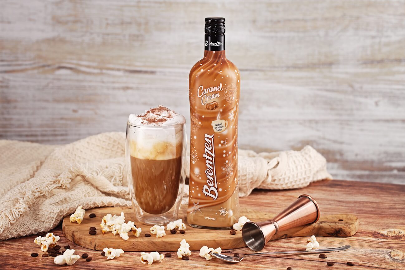 Den heißen Espresso in ein kleines doppelwandiges Glas oder eine Kaffeetasse geben, Berentzen Caramel Cream hinzugeben und mit dem warmen Milchschaum toppen. Mit 1-2 Karamellpopcorns dekorieren.